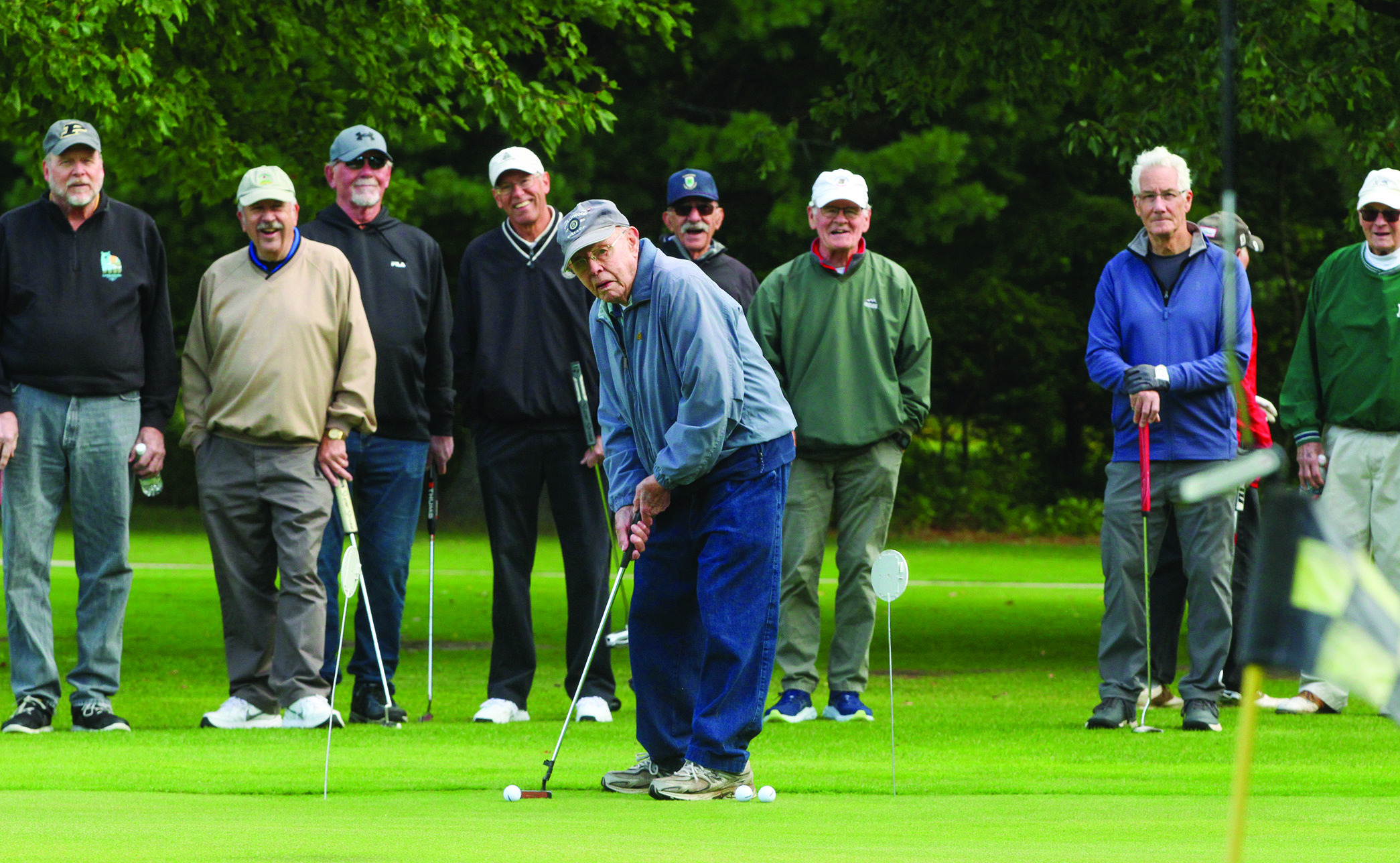 Jim Dorsey, 100, putts during a season ending putting contest for the Empire Dunes Golf Club Men's League in September. Enterprise photo by Brian Freiberger