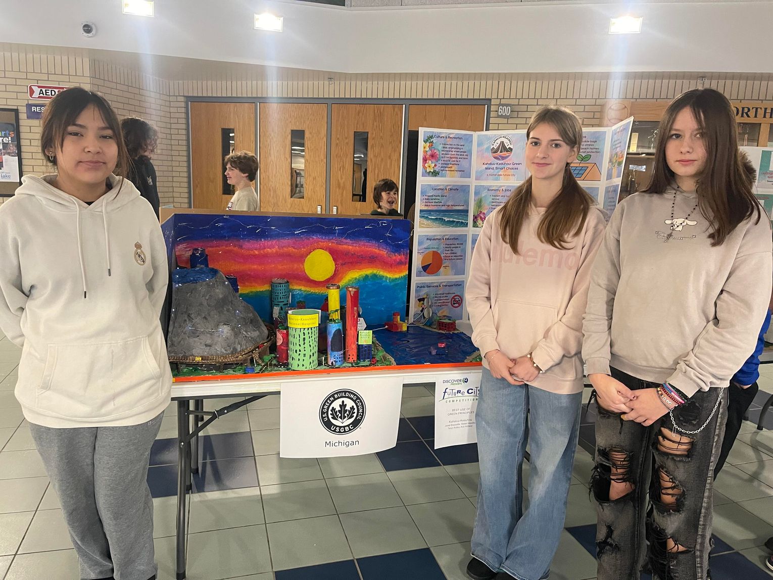 Kahaluu-Keahou team member Taryn Kelley said they wanted to create a sustainable city model based in Hawaii because of the biodiversity and natural resources present in the islands, noting the access to water, nature itself, and regional warm temperatures. The team’s city would highlight green practices such as building gardens, composting and recycling, and utilizing biodegradable products and reusable bags.