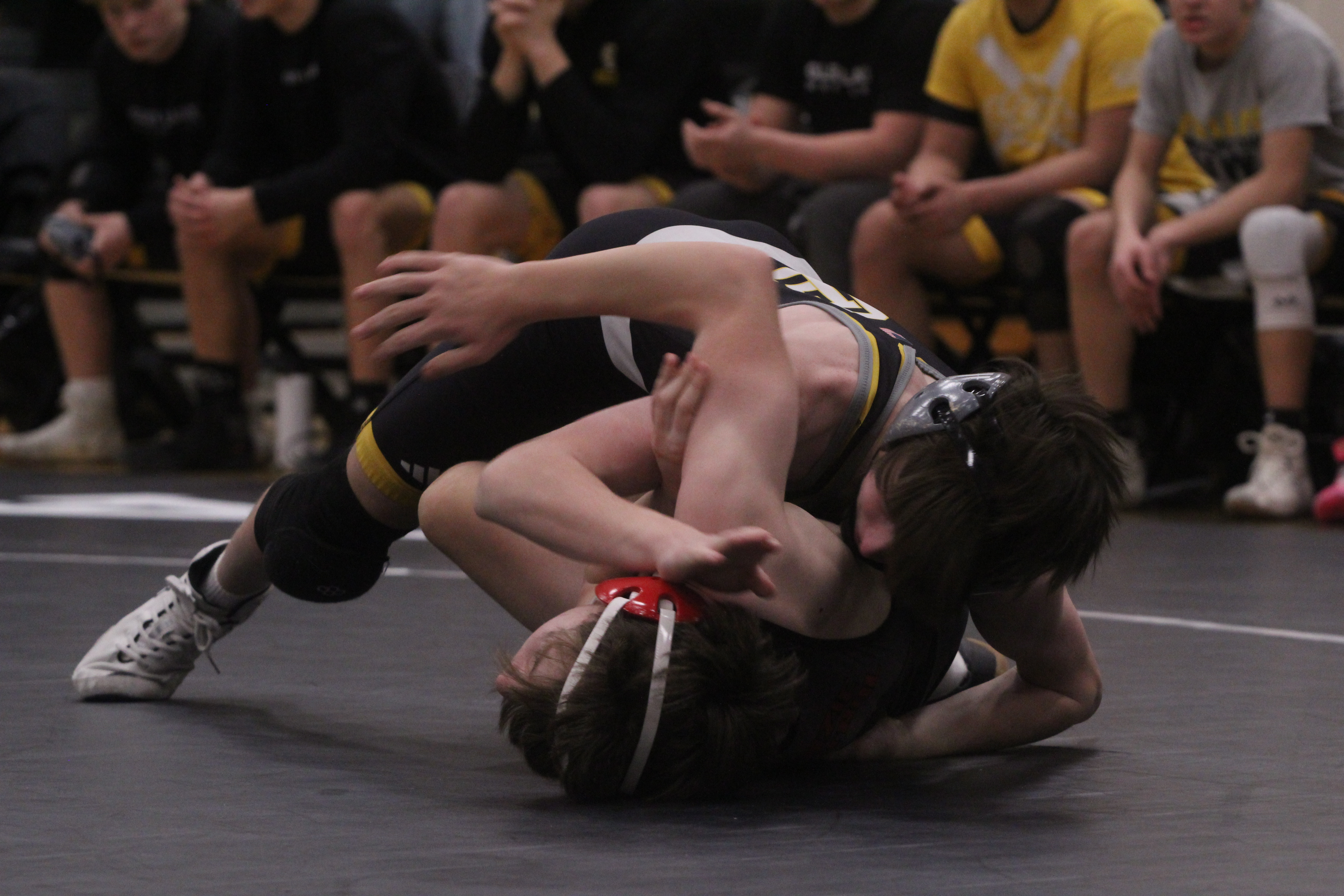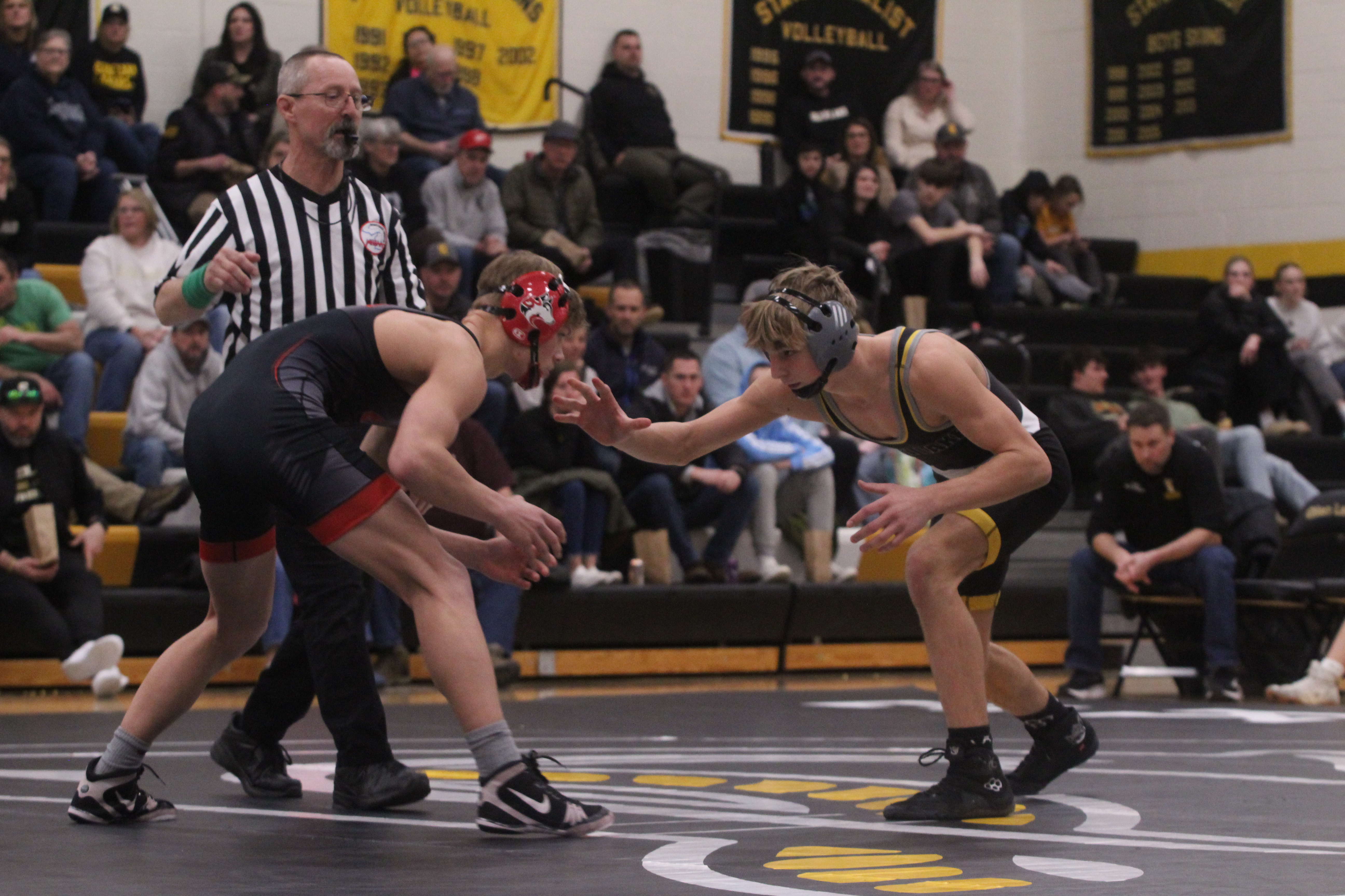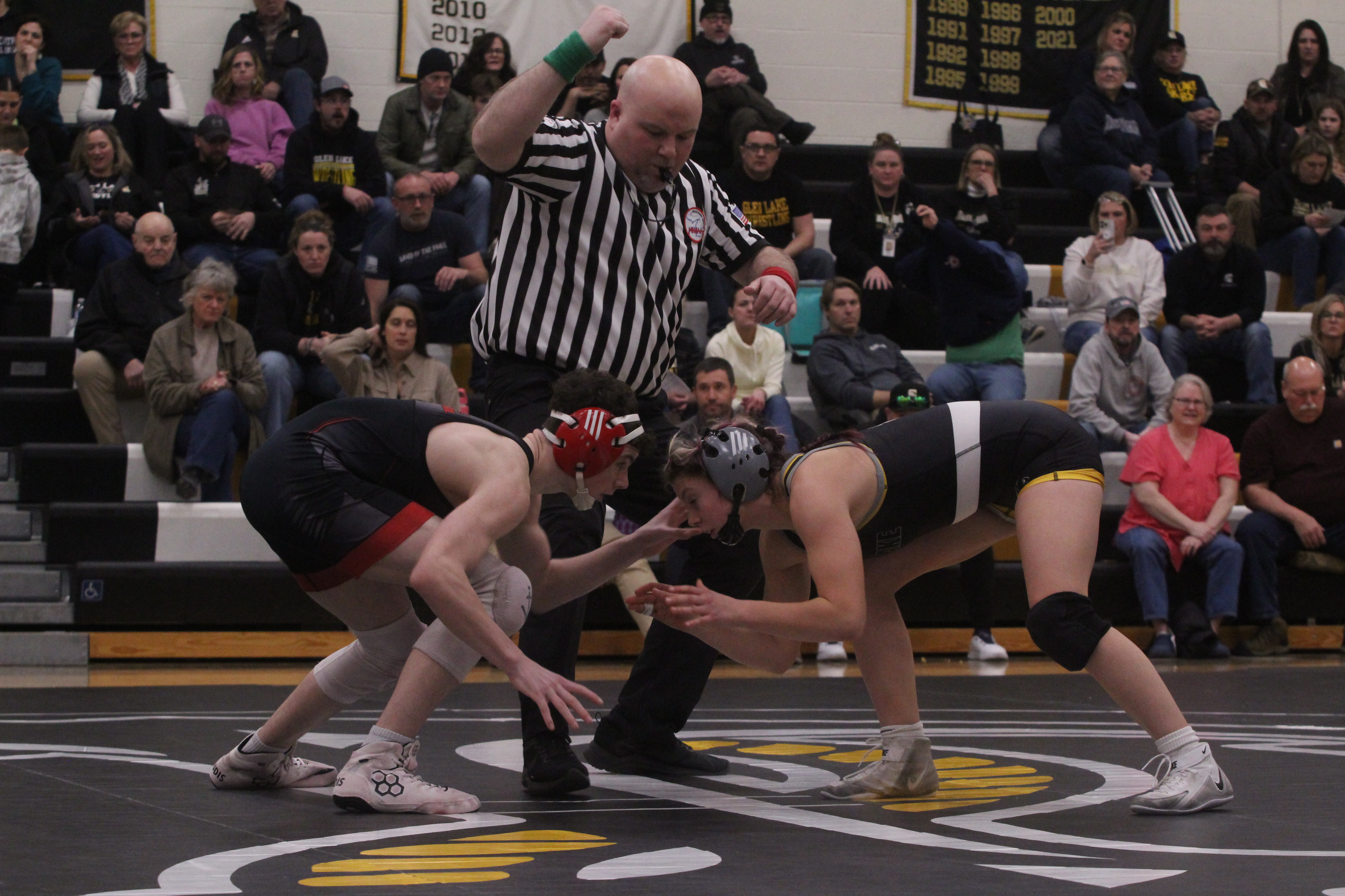 Glen Lake freshman Blake Alysworth earned the most competitive win of the night, courtesy of an escape move with less than 10 seconds left to go in the third period to give Glen Lake a slight lead halfway through the match.